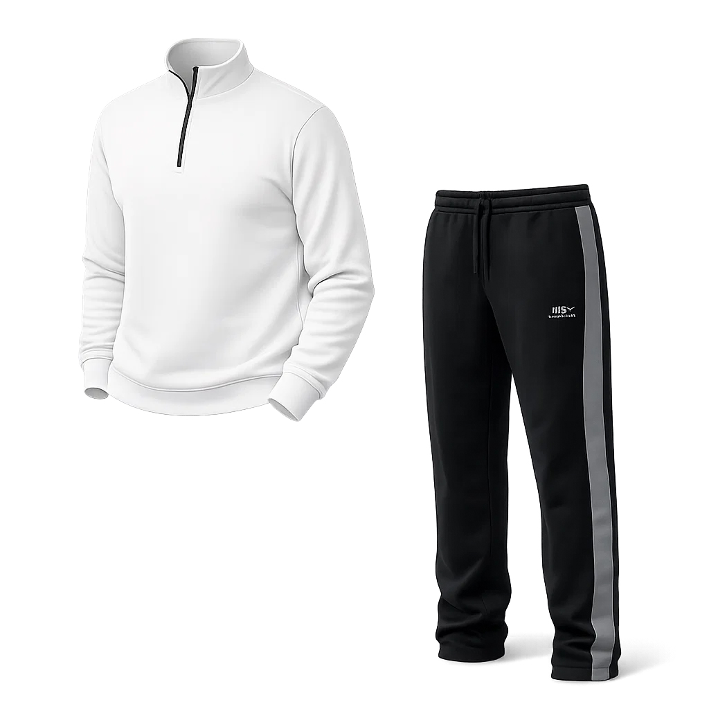 یک ست اسپرت و راحت برای استفاده روزمره و فعالیت‌های سبک، شامل دورس نیم‌زیپ و شلوار کتان بنگال با طراحی کاربردی و کیفیت بالا.